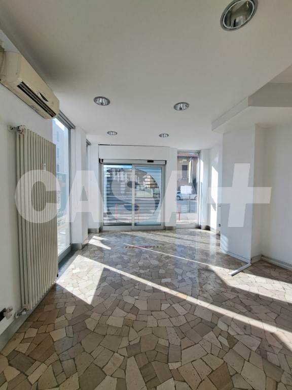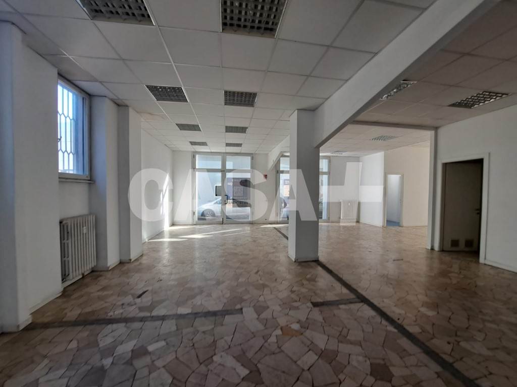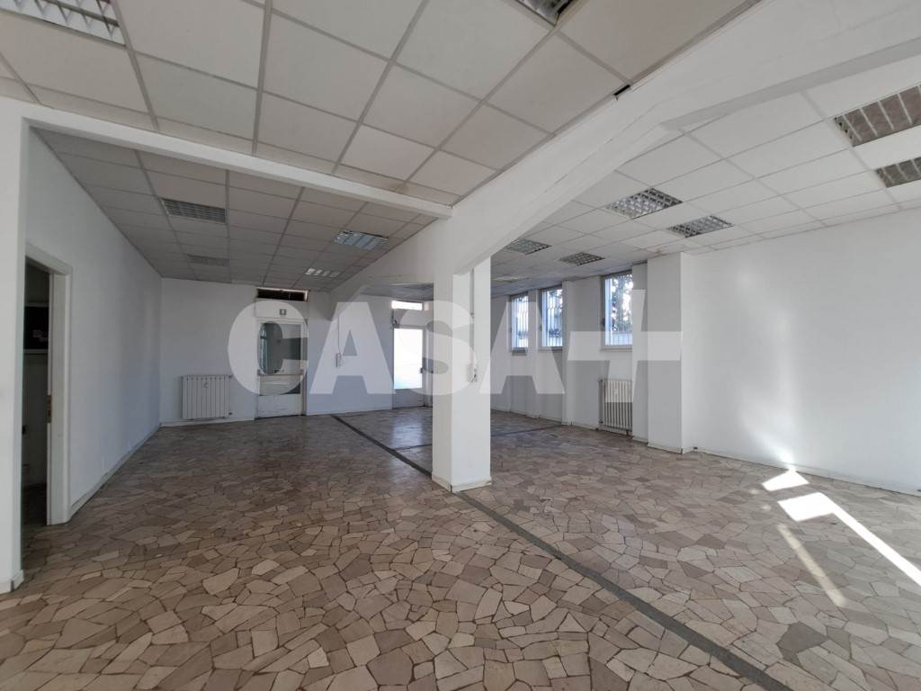 Ottima visibilità fronte strada, negozio/ufficio con vetrine di ca 160 mq con doppi servizi e doppio ingresso. Cantina di ca 40 mq ideale come deposito/magazzino.
