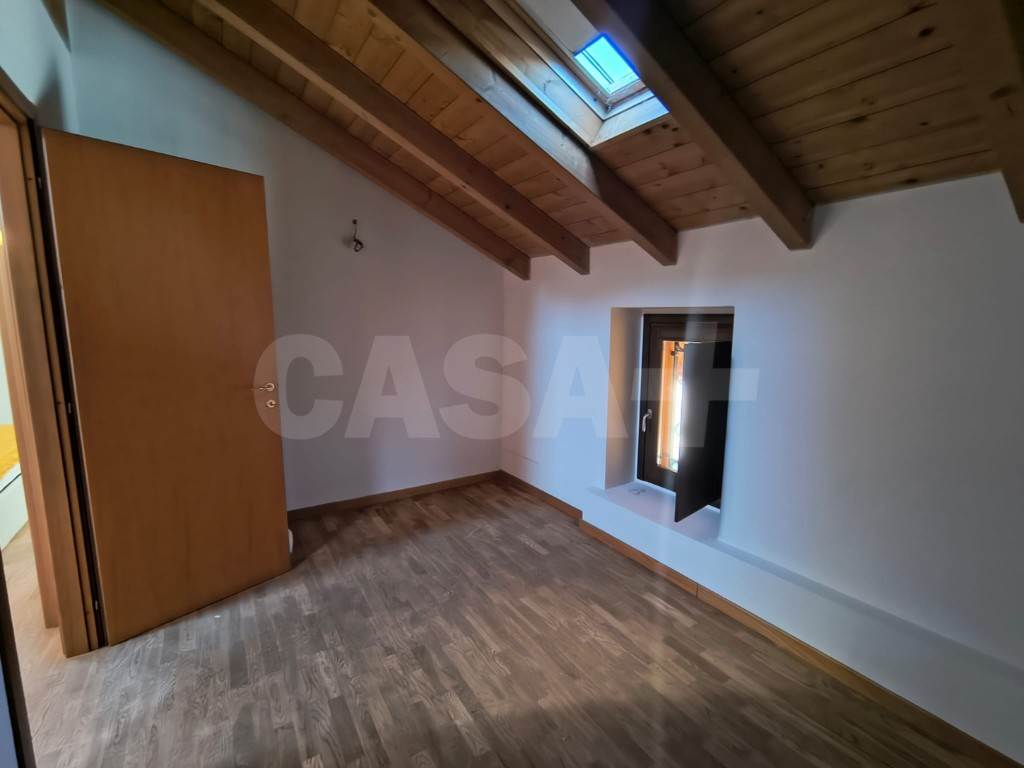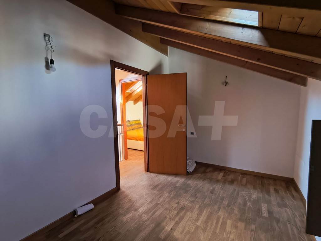 Salendo al secondo piano, si trova una zona notte mansardata caratterizzata da travi a vista e velux, una camera matrimoniale con cabina armadio e una cameretta.