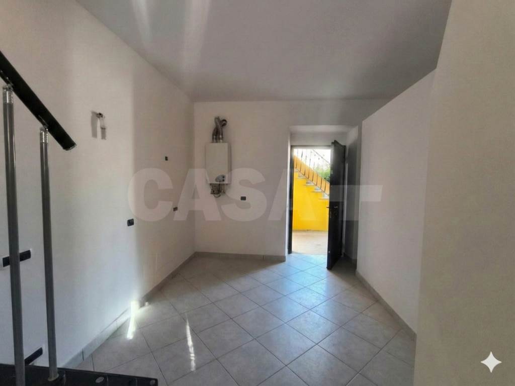Al primo piano, la zona giorno è luminosa e accogliente, con una cucina a vista che invita a momenti conviviali. Il disimpegno conduce a un bagno finestrato, perfetto per gli ospiti.